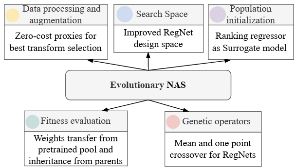 We propose an efficient evolutionary NAS framework with dataset-aware augmentation selection, improved RegNetY search space, a regressor for population initialization, and a stage transfer method, achieving good generalization across eleven datasets.